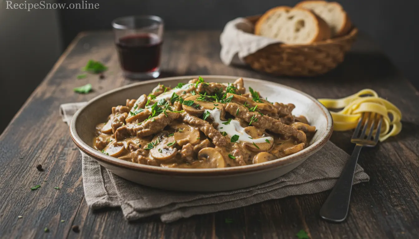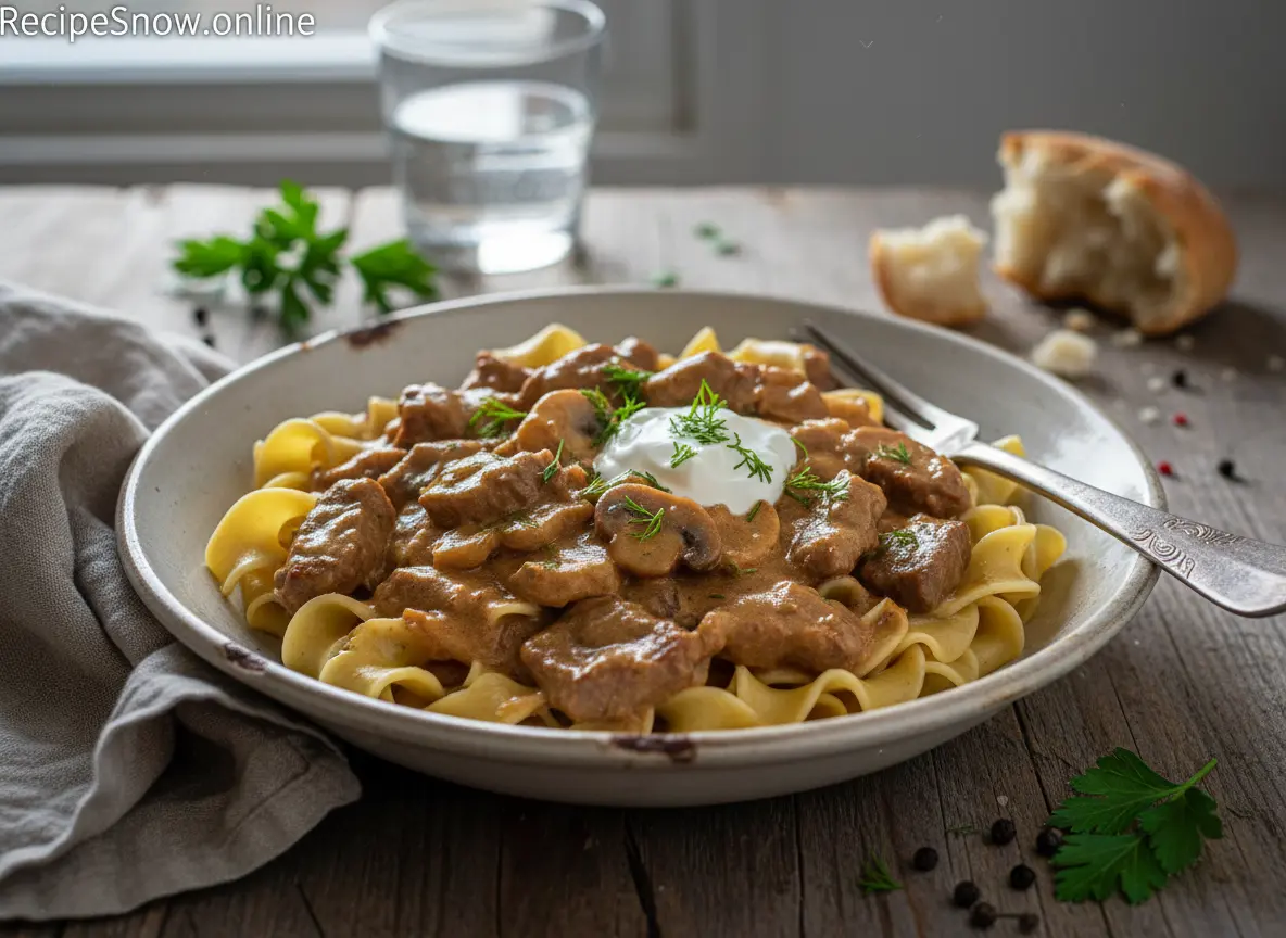 Beef Stroganoff Recipe is a reliably comforting dish that rewards straightforward technique. Sear beef quickly, brown mushrooms well, deglaze the pan, and finish gently with sour cream to preserve silkiness. Small actions — room-temperature dairy, hot searing, and careful seasoning — make the difference between good and exceptional.