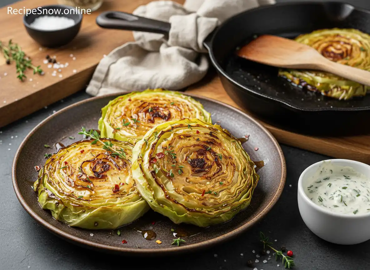 Blistered Cabbage Steaks Recipe transforms a simple vegetable into something memorable. The key steps are drying, hot sear, and a short finish to ensure tender interiors and deeply caramelized edges. The finishing sauce and toasted seeds or nuts create the textural and flavor contrasts that elevate this dish beyond ordinary roasted cabbage.